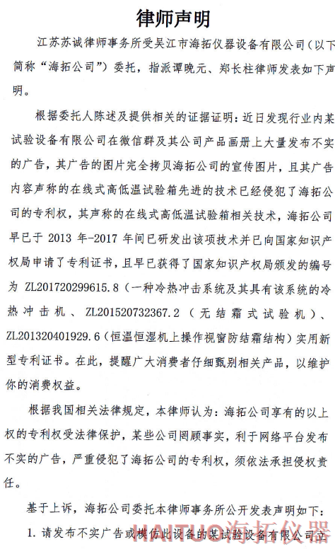 海拓儀器律師聲明:反對侵權(quán)行為 維護公司和消費者權(quán)益摘要:國內(nèi)試驗設備領(lǐng)先者吳江市海拓儀器設備有限公司委托律師事務所發(fā)布了律師聲明,該聲明指出,當前市面上出現(xiàn)了產(chǎn)品專利侵犯海拓儀器權(quán)益,海拓儀器將以法律手段維護自身利益。該律師聲明要求某試驗設備有限公司立即停止侵權(quán)行為,扯下其在網(wǎng)絡平臺的相關(guān)廣告和宣傳畫冊并同時停止生產(chǎn)同款設備。如果該設備公司不聽勸解,海拓儀器將向人民法院依法起訴該公司侵權(quán)行為,以維護自身合法權(quán)益和維護客戶消費權(quán)益,并建議廣大消費者仔細甄別相關(guān)產(chǎn)品。? ? ? ?近日,吳江市海拓儀器設備有限公司委托律師事務所發(fā)布了律師聲明,該聲明指出,當前市面上出現(xiàn)了產(chǎn)品專利侵犯海拓儀器權(quán)益,海拓儀器將以法律手段維護自身利益。??事件源起于海拓儀器發(fā)現(xiàn)市面上有同類設備公司通過完全拷貝海拓儀器產(chǎn)品宣傳圖片,在微信群及該公司產(chǎn)品畫冊上大量發(fā)布不實廣告。??聲明指出,該廣告聲稱的在線式高低溫試驗箱的技術(shù)侵犯了海拓儀器的專利權(quán),該產(chǎn)品專利由海拓儀器 -